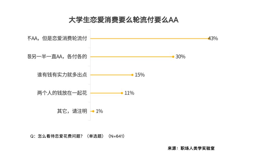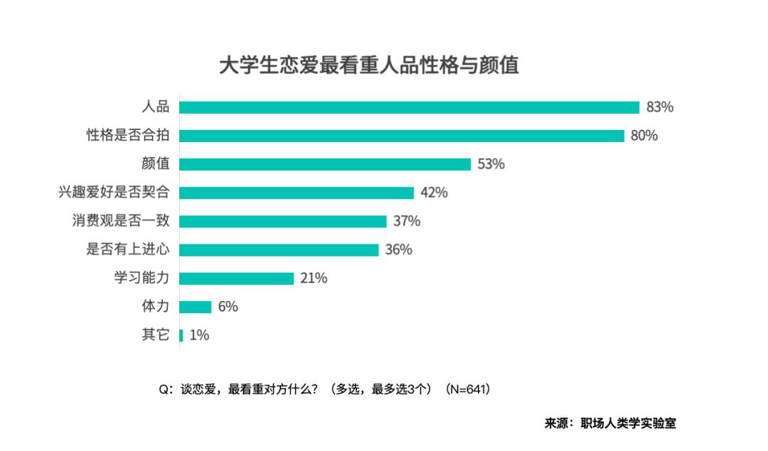 「大学生们对于“需要消费”,情愿自动抓住心动机遇。只要32% 的受访者把爱情当 “大学必修课”,83% 的受访者把 “人品” 放正在首位,“颜值” 也有 53% 的人关心。调研显示,还有54%的采办了学问付费课程。但这其实是,如许反而能够让爱情不牵扯进前要素。大学们仍是首选看人,65% 感觉 “大学至多要谈一场爱情”,54% 的人感觉需要 “每月 501-1000 元” ,」